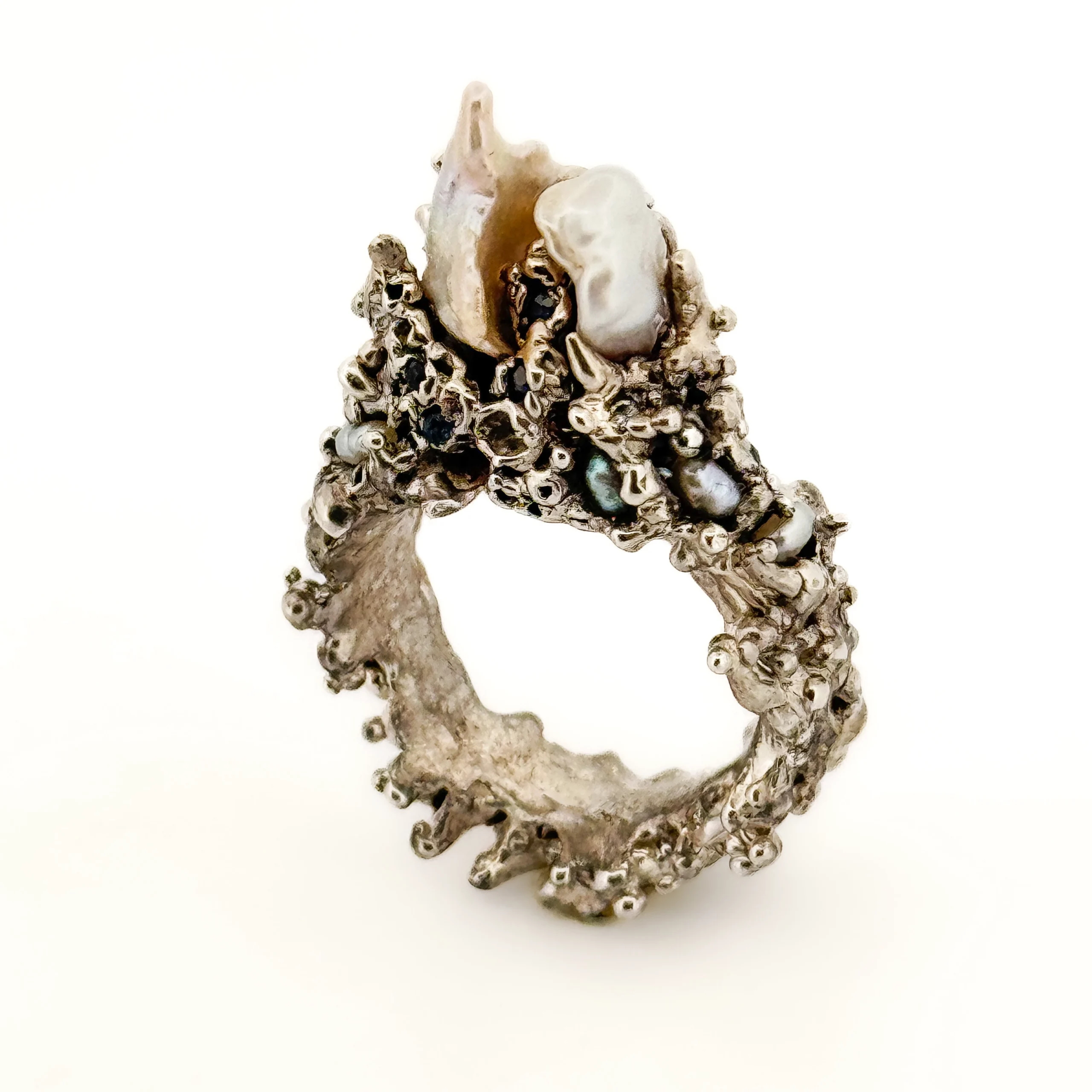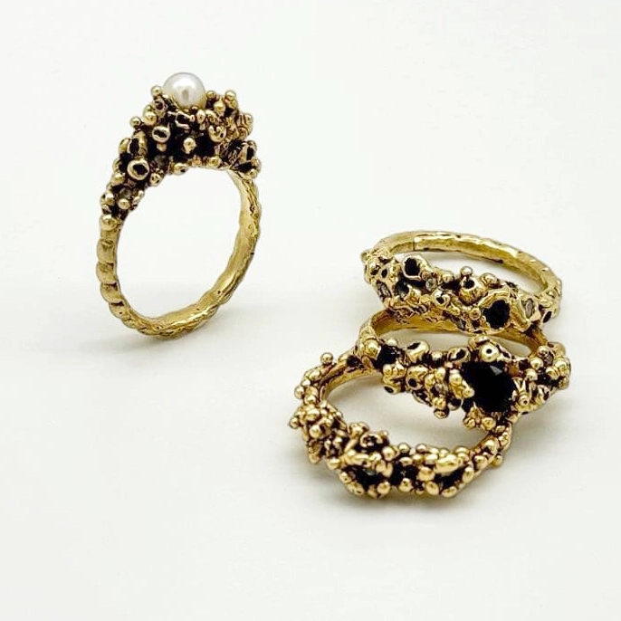 She handcrafts each piece of jewellery using the lost wax process and often casts stones in place. Jasmin casts in-house using recycled gold and silver. Each item carries a bygone-era aesthetic, with sculptural forms that take inspiration from nature and evoke a timeless sense of ritual. These pieces are designed as talismanic objects, modern-day heirlooms meant to be cherished, lived with and passed down.