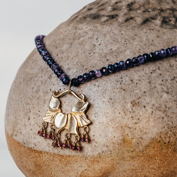 “Precious raw materials are transformed by using traditional metalworking techniques such hammering, filing, stone setting, wax carving and soldering. I create every single item by hand. Pursuing an organic, floral and figurative style. I’m always trying to create a classic or ‘living feeling’ piece (such as the Tiaras.) My aim is to bring quality and design together, to produce carefully crafted Jewellery work that is of heirloom and artistic merit. I feel extremely proud that I’m able to be part of the importance of keeping our skills as craftsmen alive here in the UK”