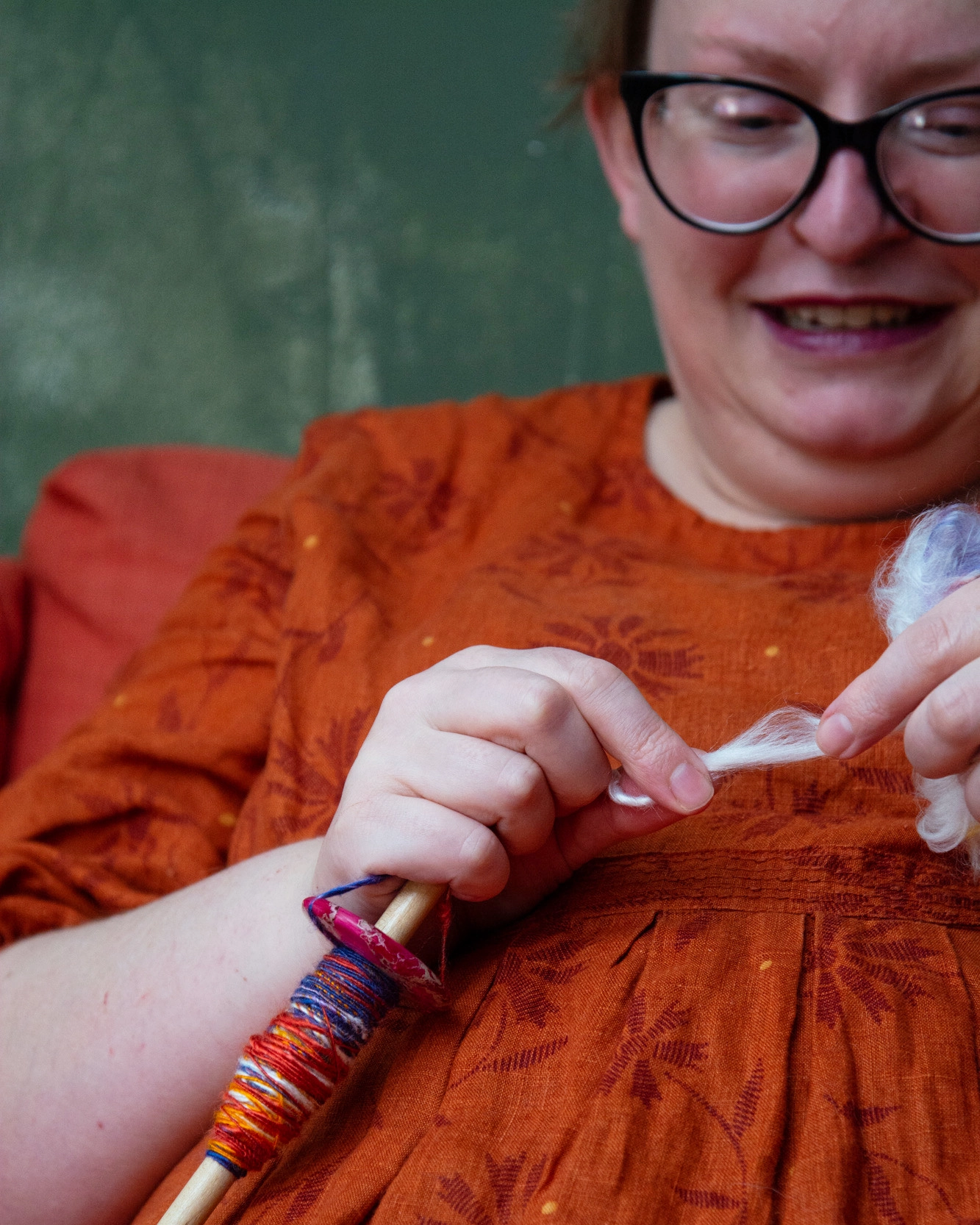 Jan particularly enjoys the mental health benefits of spinning. The calming effects and the looking back in time (Jan is an archaeologist by training) have gripped her as she works from her home studio, carefully helped by her feline assistant, Ruby, who is the chief wool sorter.