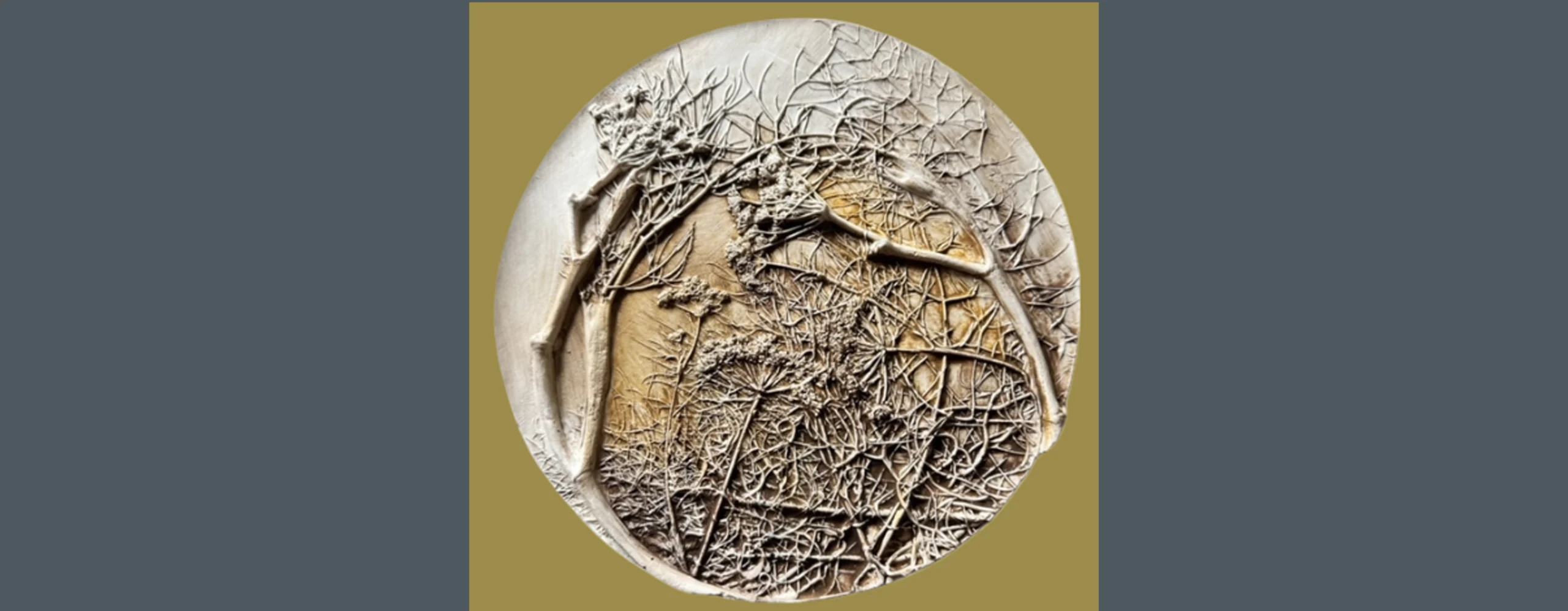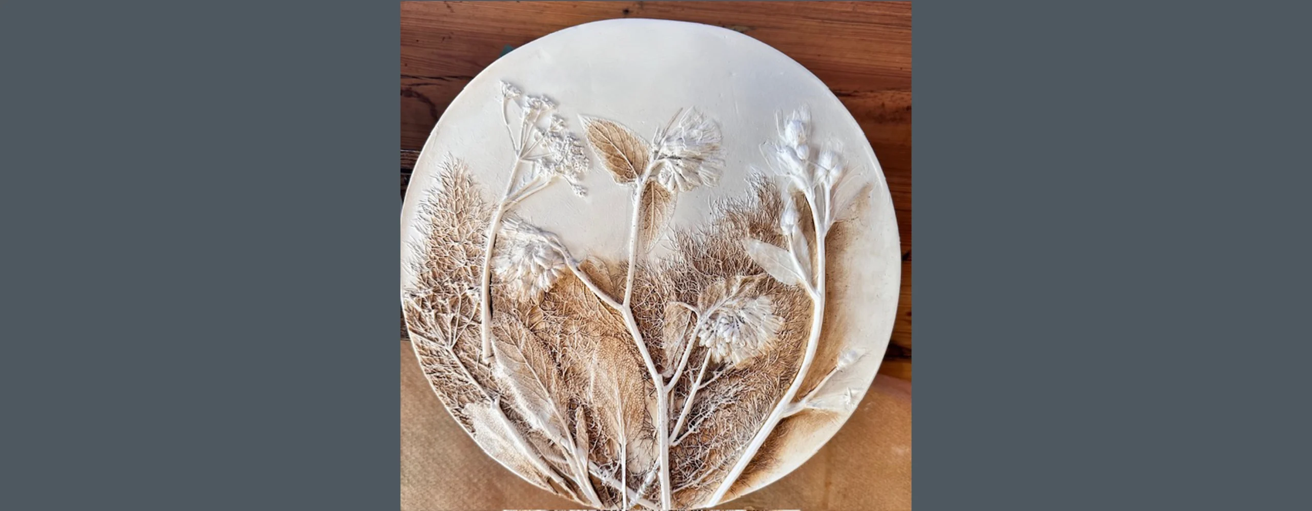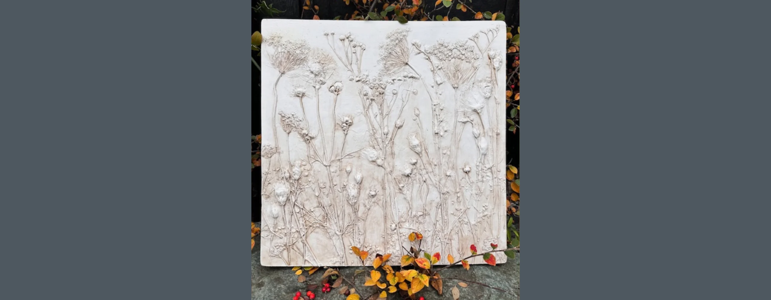 The fascinating art of bas-relief enables a plant’s very fine details to be celebrated and its structures and forms explored. A clay base is laid and the plants are pressed into the clay and then removed. A frame is then pressed into the clay around the design and plaster is poured over to set into all the tiny details. This process captures the plant frozen in time like a fossil and lasts long after the flower has faded.