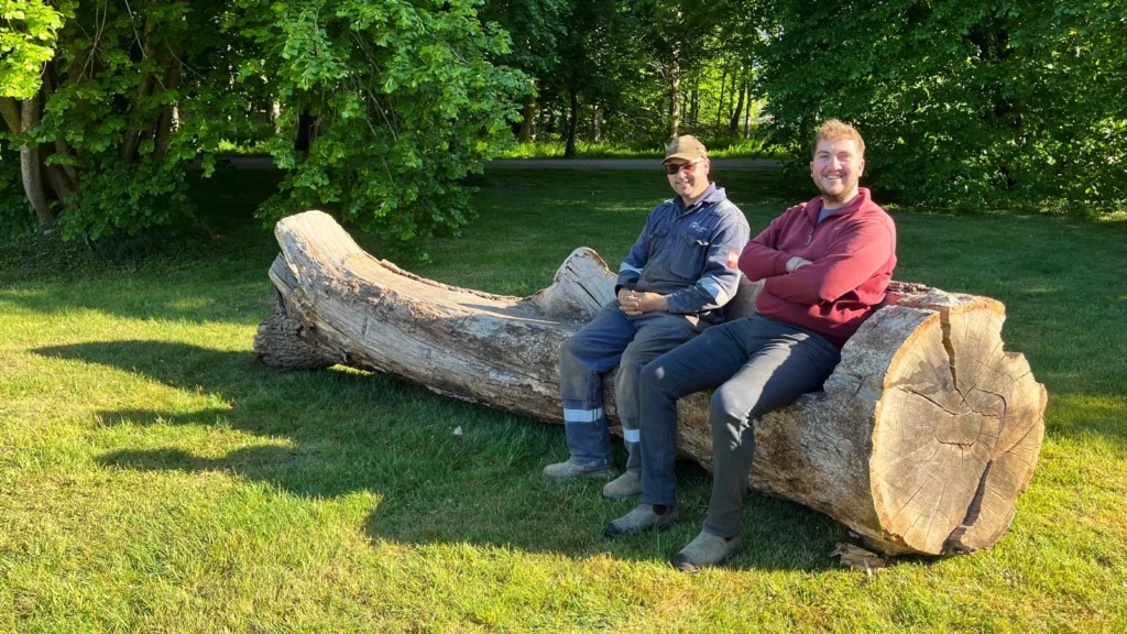 Rather than being lost, the log has been thoughtfully carved into a simple wooden bench, an understated piece that celebrates the natural beauty and strength of oak. The shape and texture of the wood have been preserved to honour its origins and character.